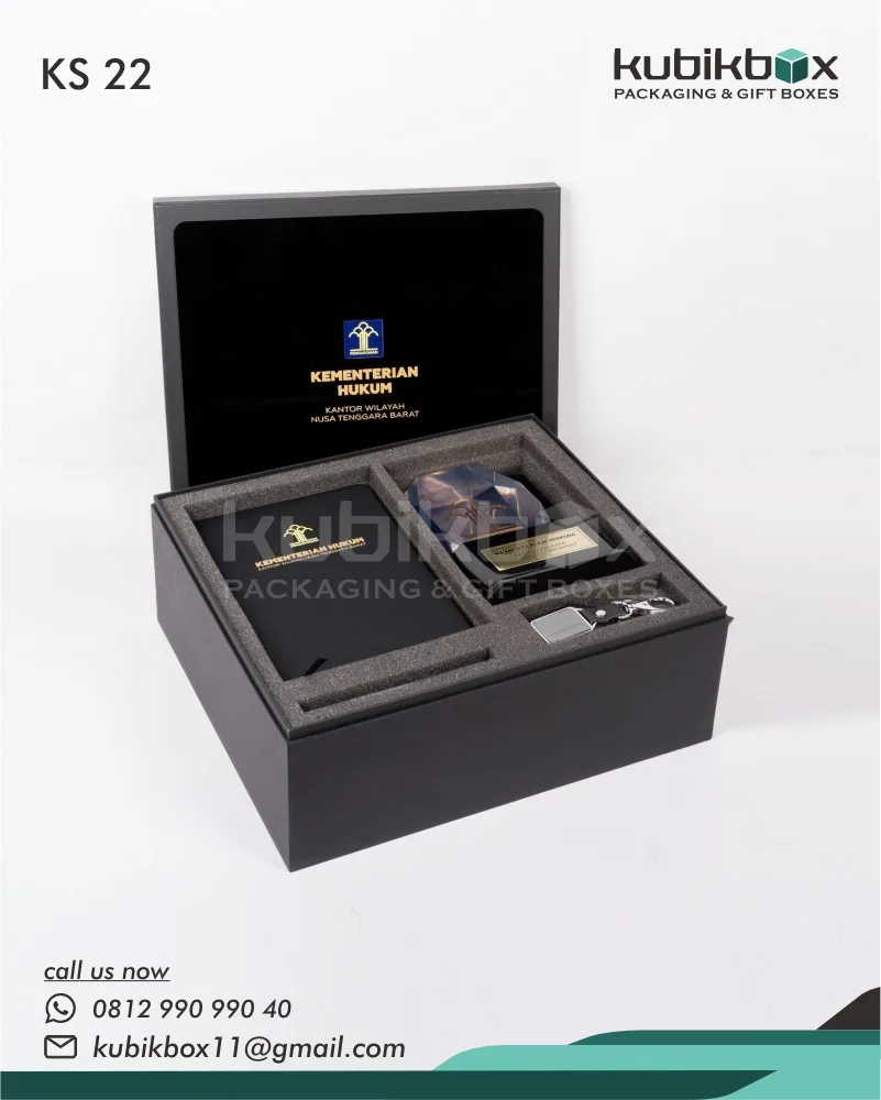 Kotak Souvenir Giftset Kementerian Hukum Kantor Wilayah NTB dirancang sebagai simbol apresiasi yang sepadan dengan nilai tersebut. Box hitam elegan dengan sekat rapi melindungi setiap item di dalamnya, menciptakan pengalaman memberi yang terstruktur, berkelas, dan mencerminkan citra institusi yang kredibel.